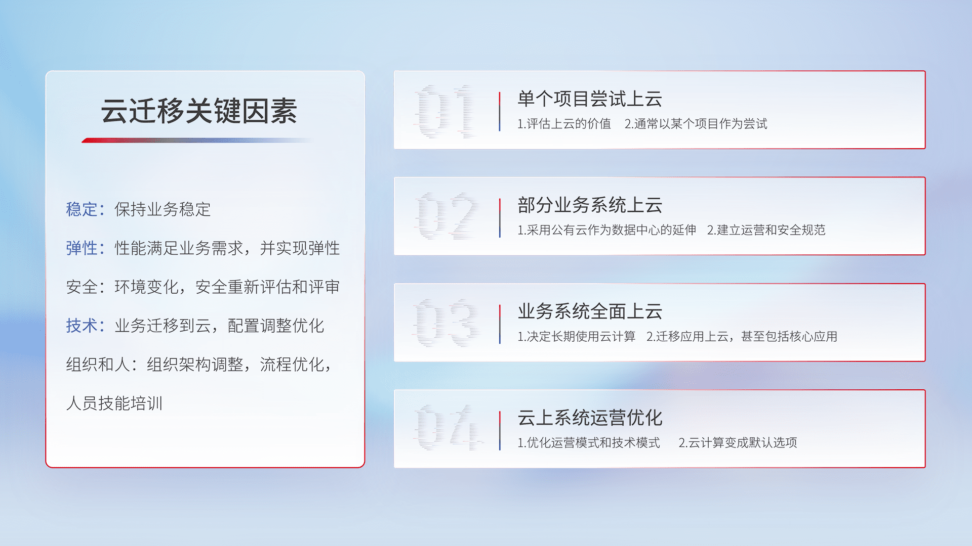结合实际业务,,从规划设计、、、云平台选型、、云原生改造、、、数据迁移、、、集成交付,,,,迁移全过程为客户识别最佳上云路径,,,做好风险识别管理,,设计网络架构、、身份权限、、、安全审计合规、、、操作审计、、、日志审计、、、、监控告警策略、、多站点容灾设计等,,,对云上基础设施进行整体规划,,提升IT治理水平,,,以满足弹性、、、、高可用、、高性能的需求。。。