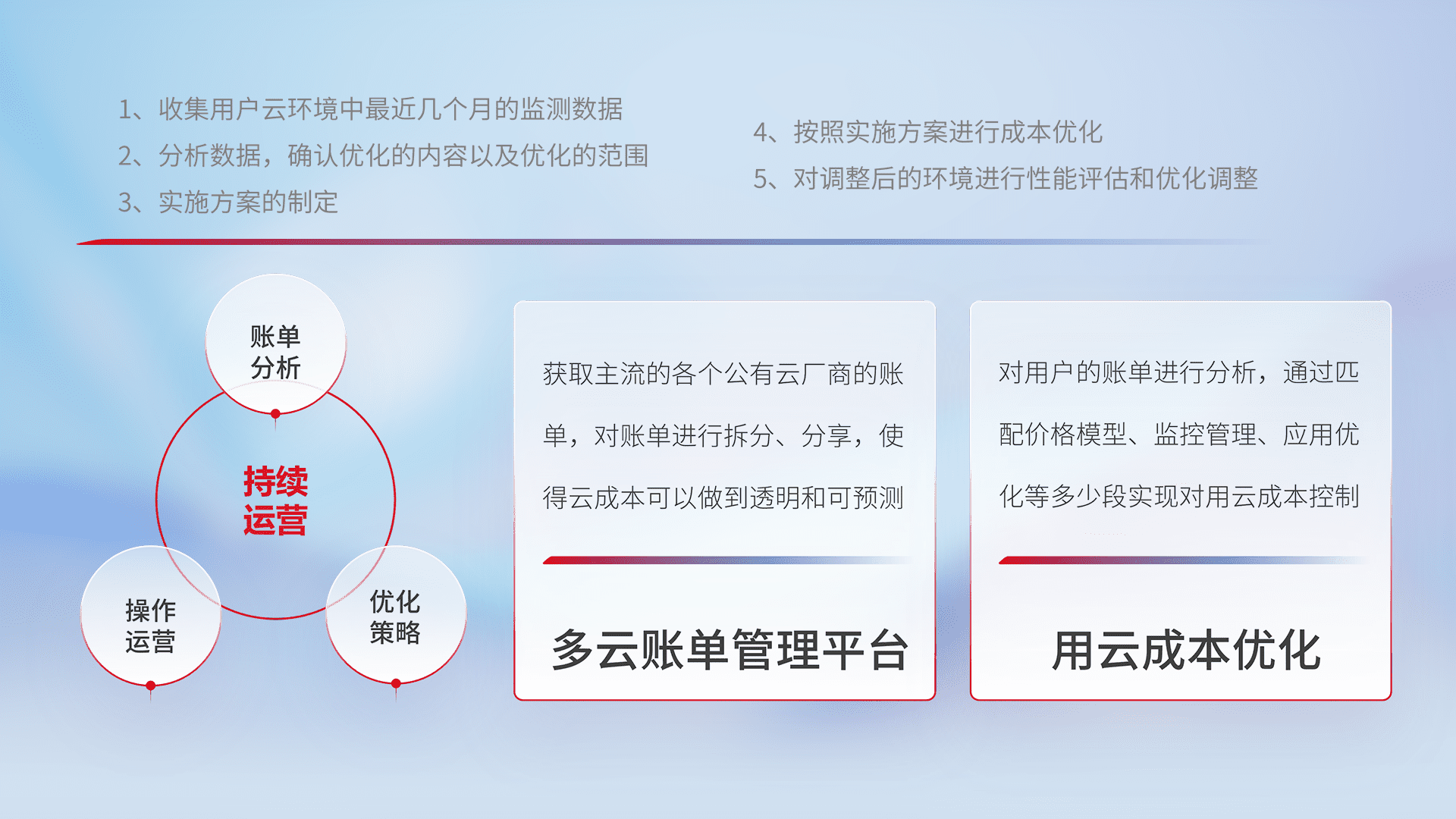 通过多云纳管,,,以统一的资源数据模型把客户的云资源进行抽象和封装,,进而实现对多云资源的统一操作,,,保障云资源管理的可靠性、、、稳定性与可用性。。。量身定制化运维内容,,,,配置、、开发运维、、补丁管理、、、、备份、、、、监控、、、、认证和访问管理、、、、审计和日常巡检等,,,,保障在用云过程中的可靠度,,,稳定度以及高可用率。。。