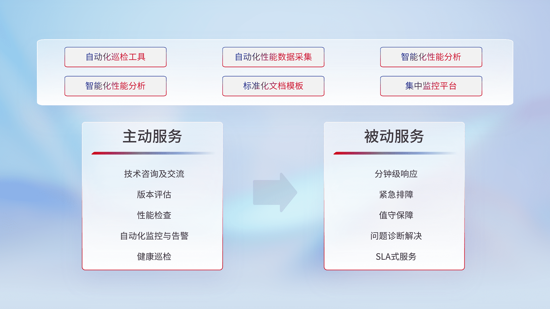 智能化工具和标准化文档,,,保障服务质量,,,,提供主动服务(包含技术咨询、、、版本评估、、、性能检查、、、、自动化监控与告警、、、、健康巡检)和被动服务包含(分钟级响应、、、紧急排障、、值守保障、、、问题诊断解决、、SLA服务)。。